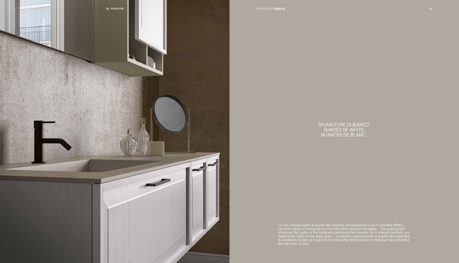La luce radente esalta la qualità dei materiali, accarezzando il top in Concrete effetto
