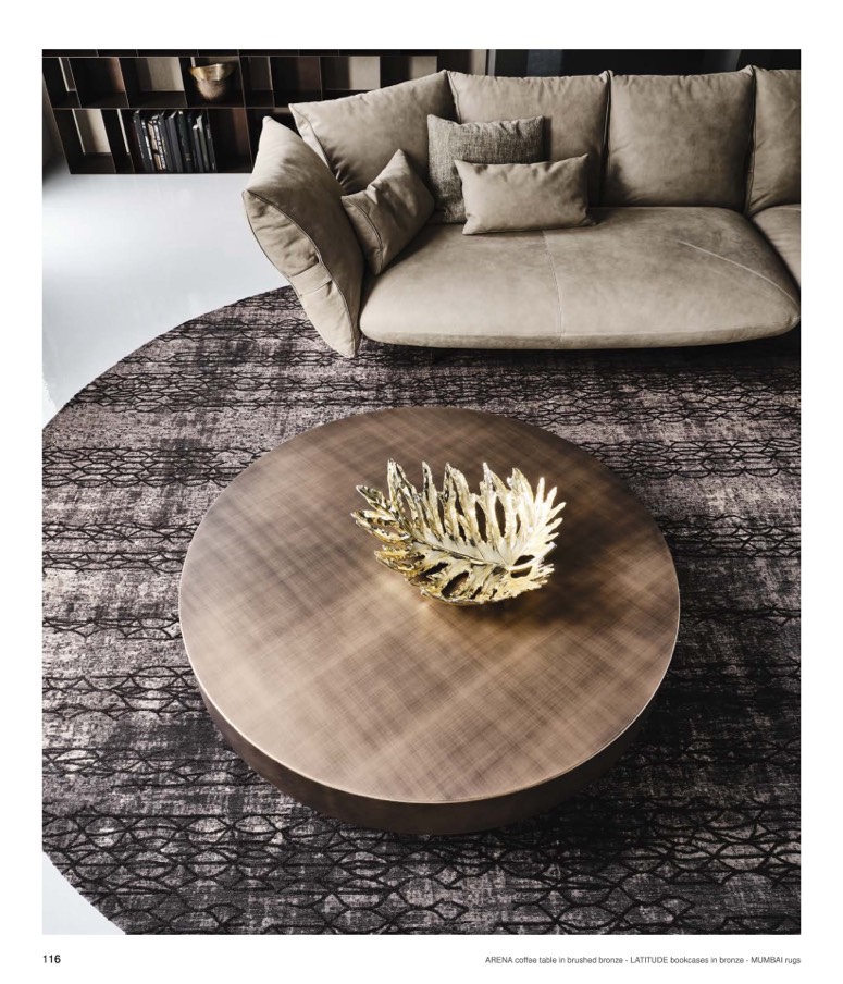 ARENA coffee table in brushed bronze - LATITUDE bookcases in bronze - MUMBAI rugs