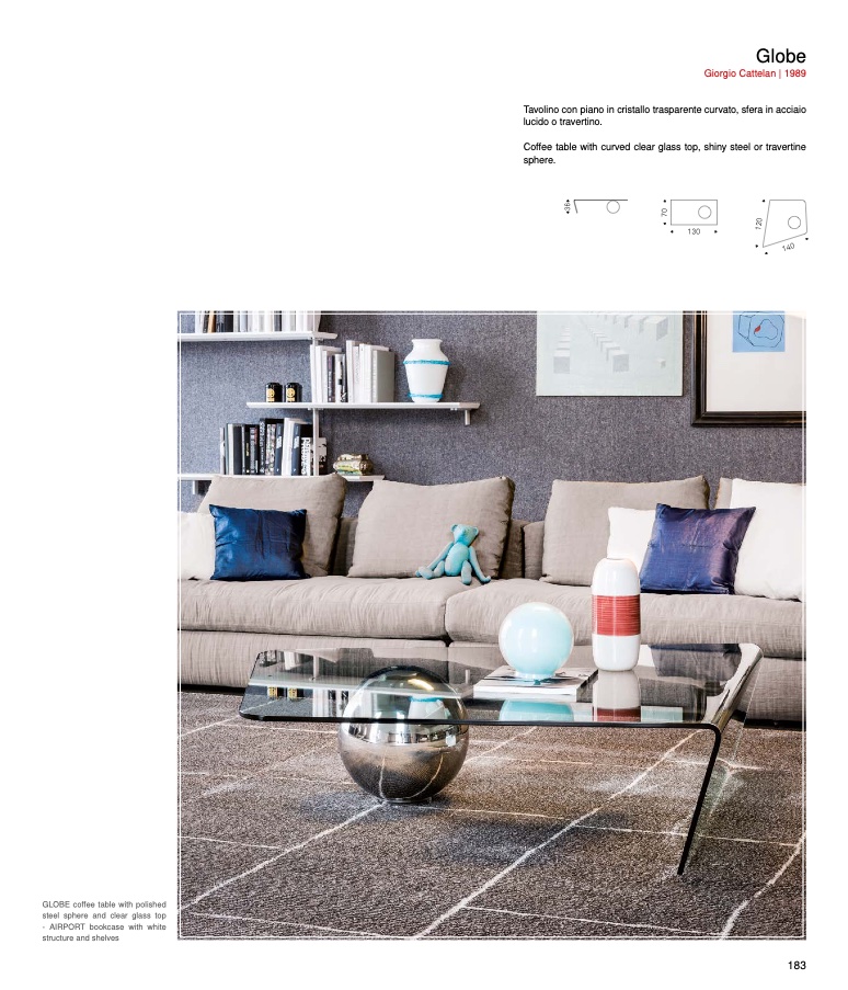Tavolino con piano in cristallo trasparente curvato, sfera in acciaio