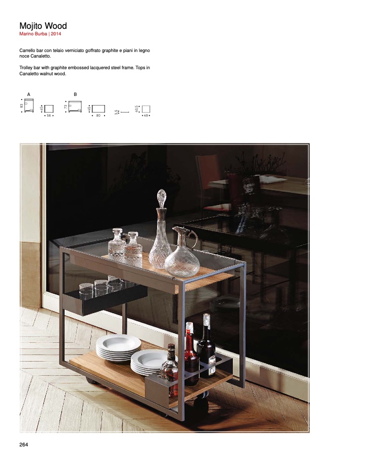 Trolley bar with graphite embossed lacquered steel frame. Tops in
