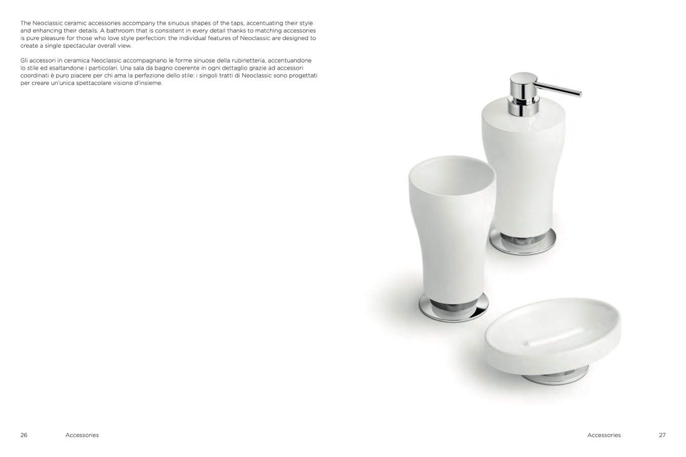 Gli accessori in ceramica Neoclassic accompagnano le forme sinuose della rubinetteria, accentuandon