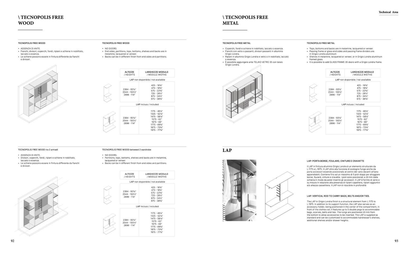 • Shelves in melamine, lacquered or veneer, or in Grigio Londra aluminium