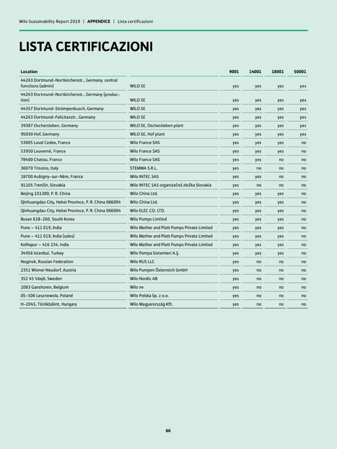 Wilo Sustainability Report 2019 | APPENDICE | Lista certificazioni