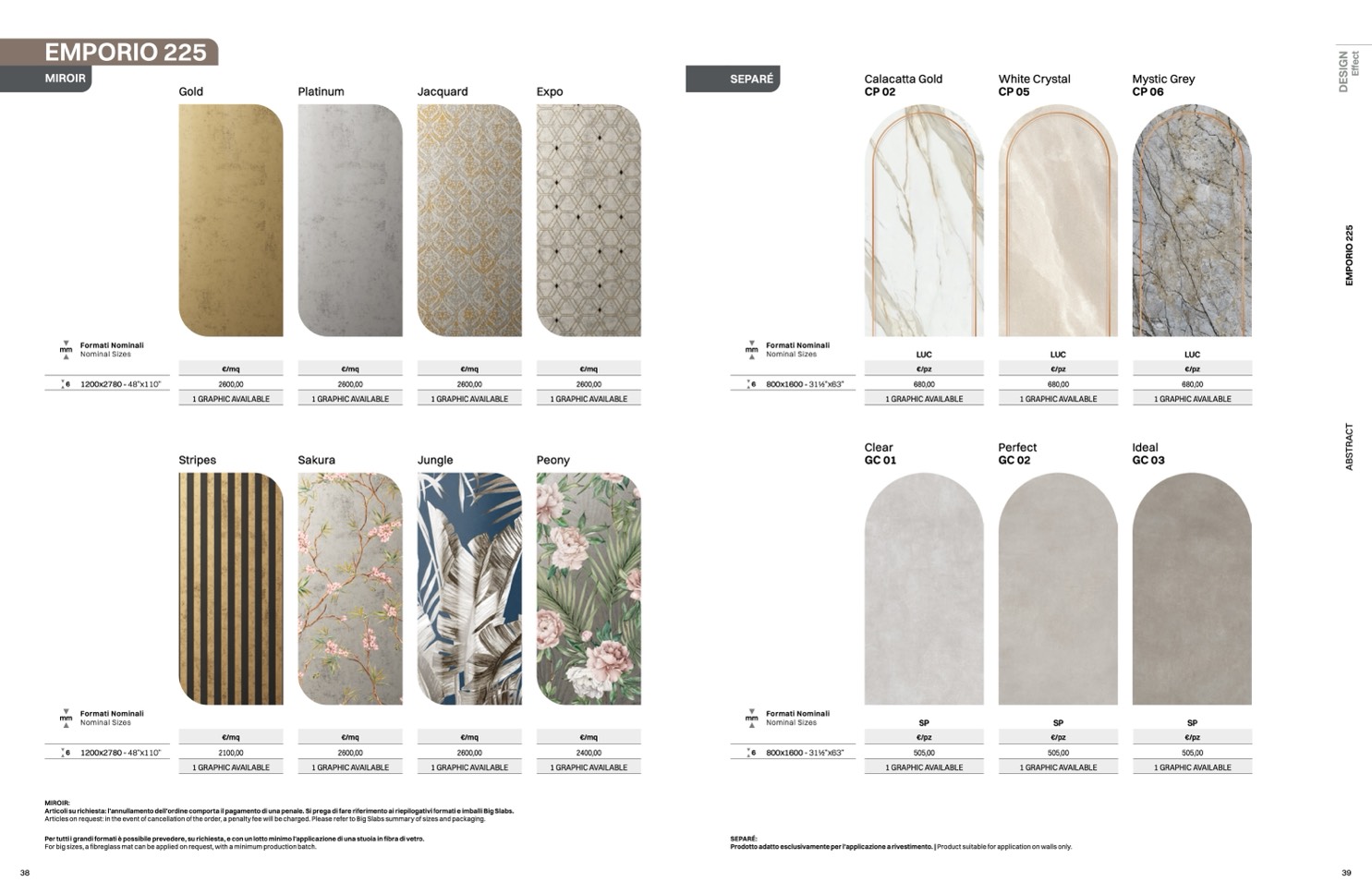 Articoli su richiesta: l’annullamento dell’ordine comporta il pagamento di una penale. Si prega di fare riferimento ai riepilogativi formati e imballi Big Slabs.