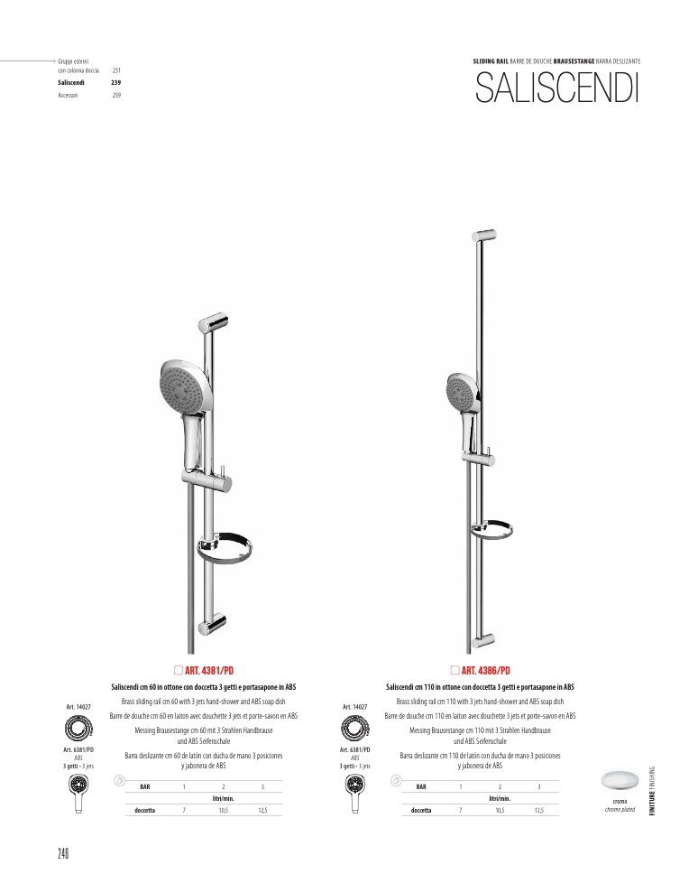 Saliscendi cm 110 in ottone con doccetta 3 getti e portasapone in ABS