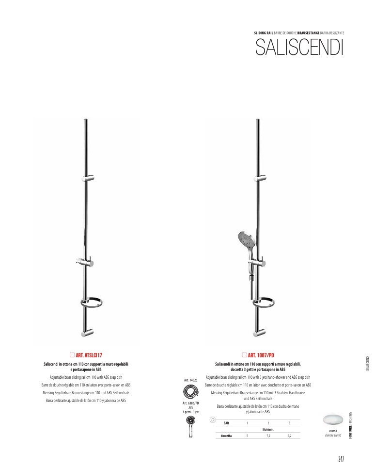 Adjustable brass sliding rail cm 110 with 3 jets hand-shower and ABS soap dish