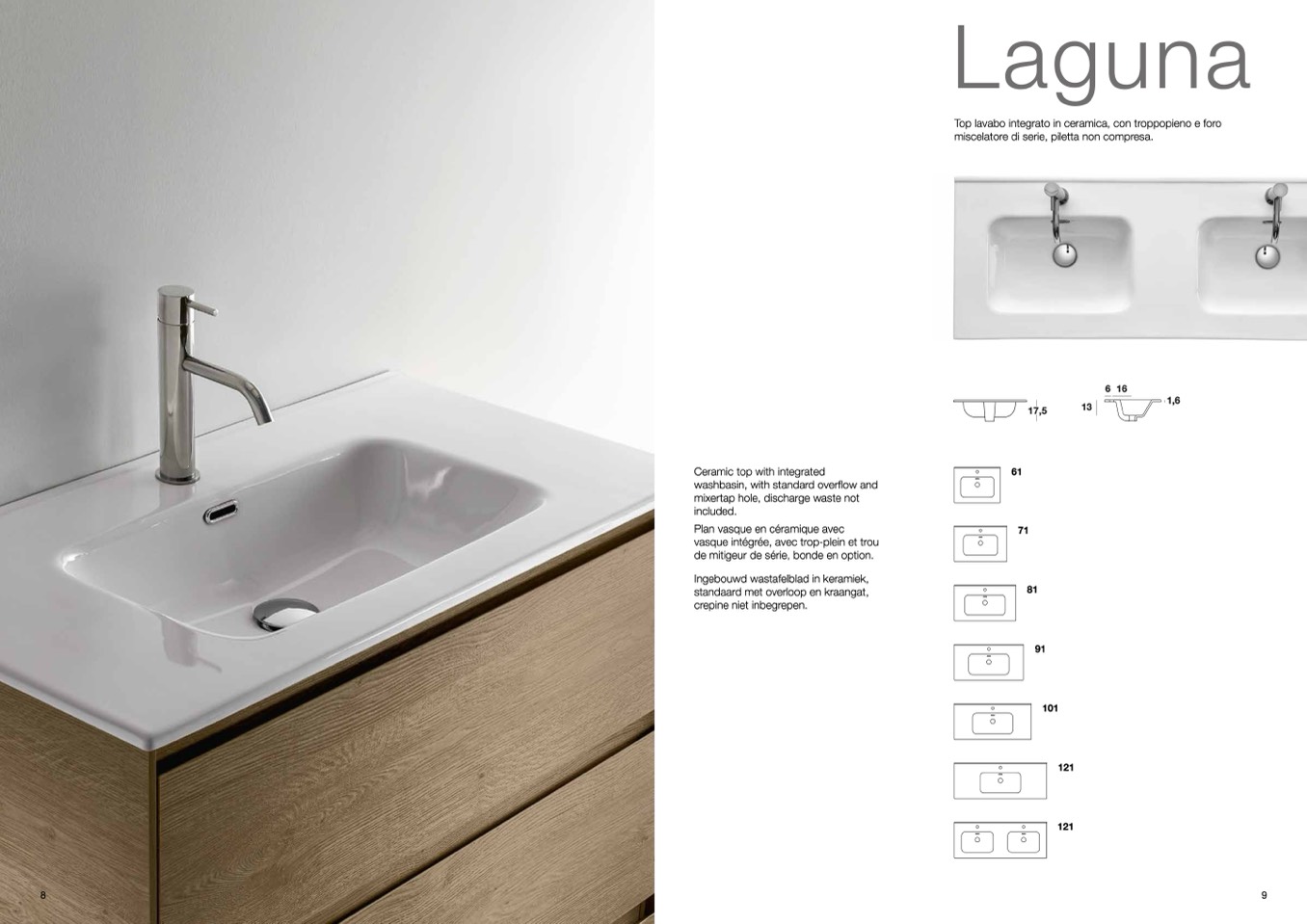 Top lavabo integrato in ceramica, con troppopieno e foro