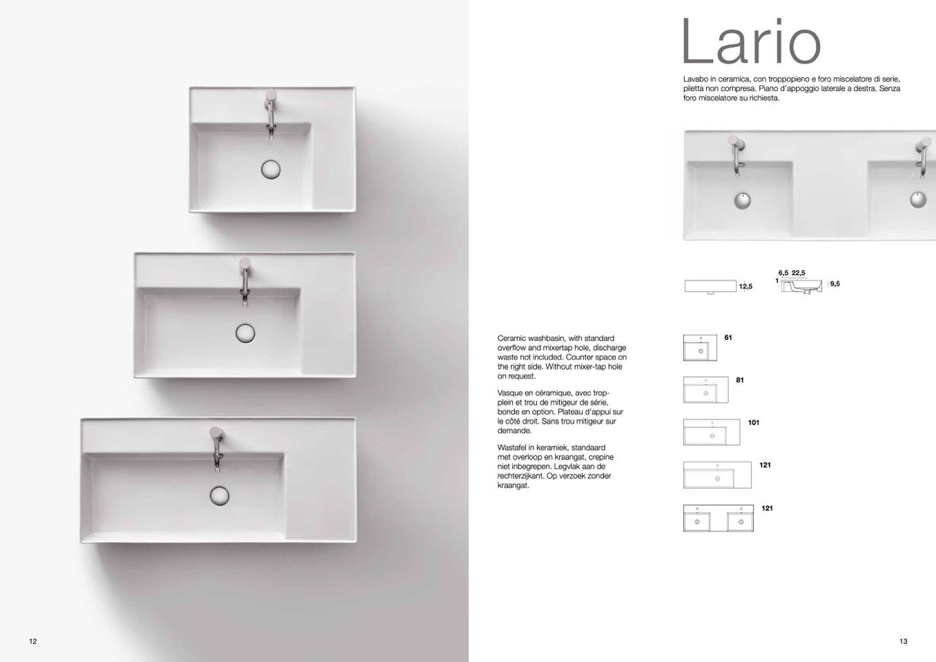 Lavabo in ceramica, con troppopieno e foro miscelatore di serie,