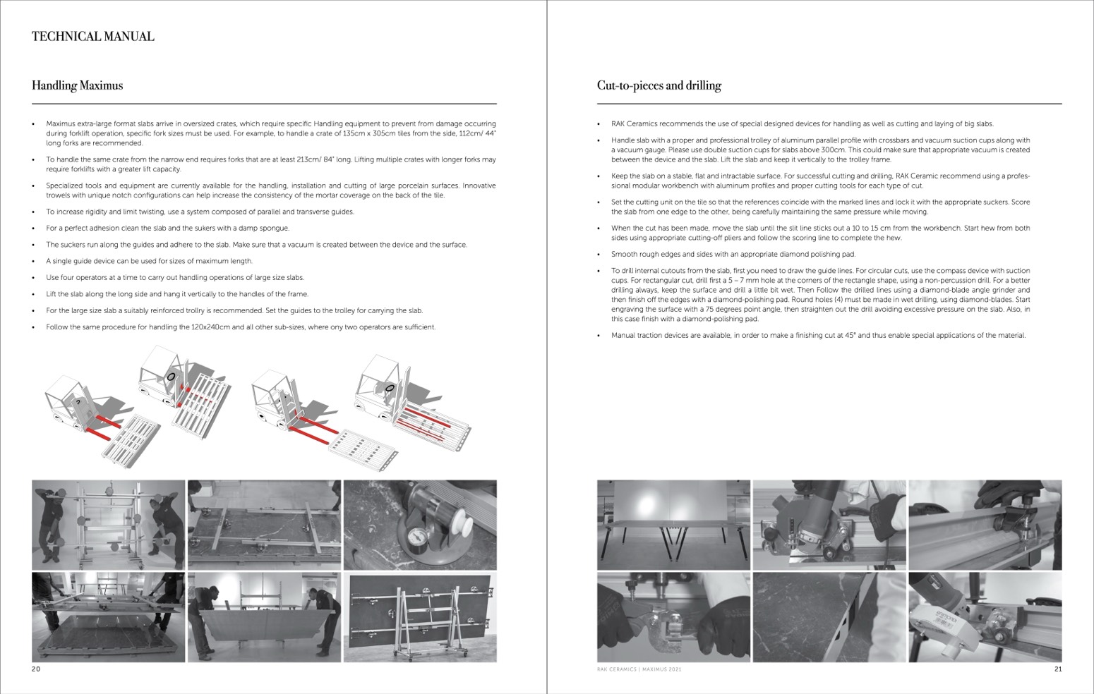 RAK Ceramics recommends the use of special designed devices for handling as well as cutting and laying of big slabs.