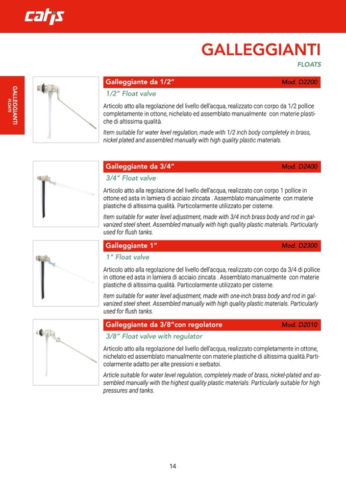 Item suitable for water level adjustment, made with 3/4 inch brass body and rod in gal-
