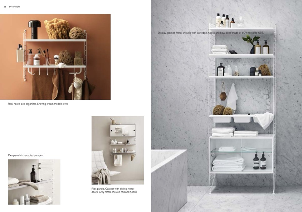 Display cabinet, metal shelves with low edge, hooks and bowl shelf made of 60% recycled ABS.
