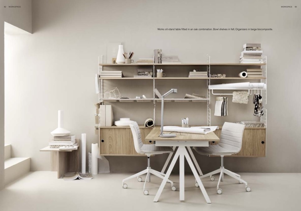 Works sit-stand table fitted in an oak combination. Bowl shelves in felt. Organizers in beige biocomposite.