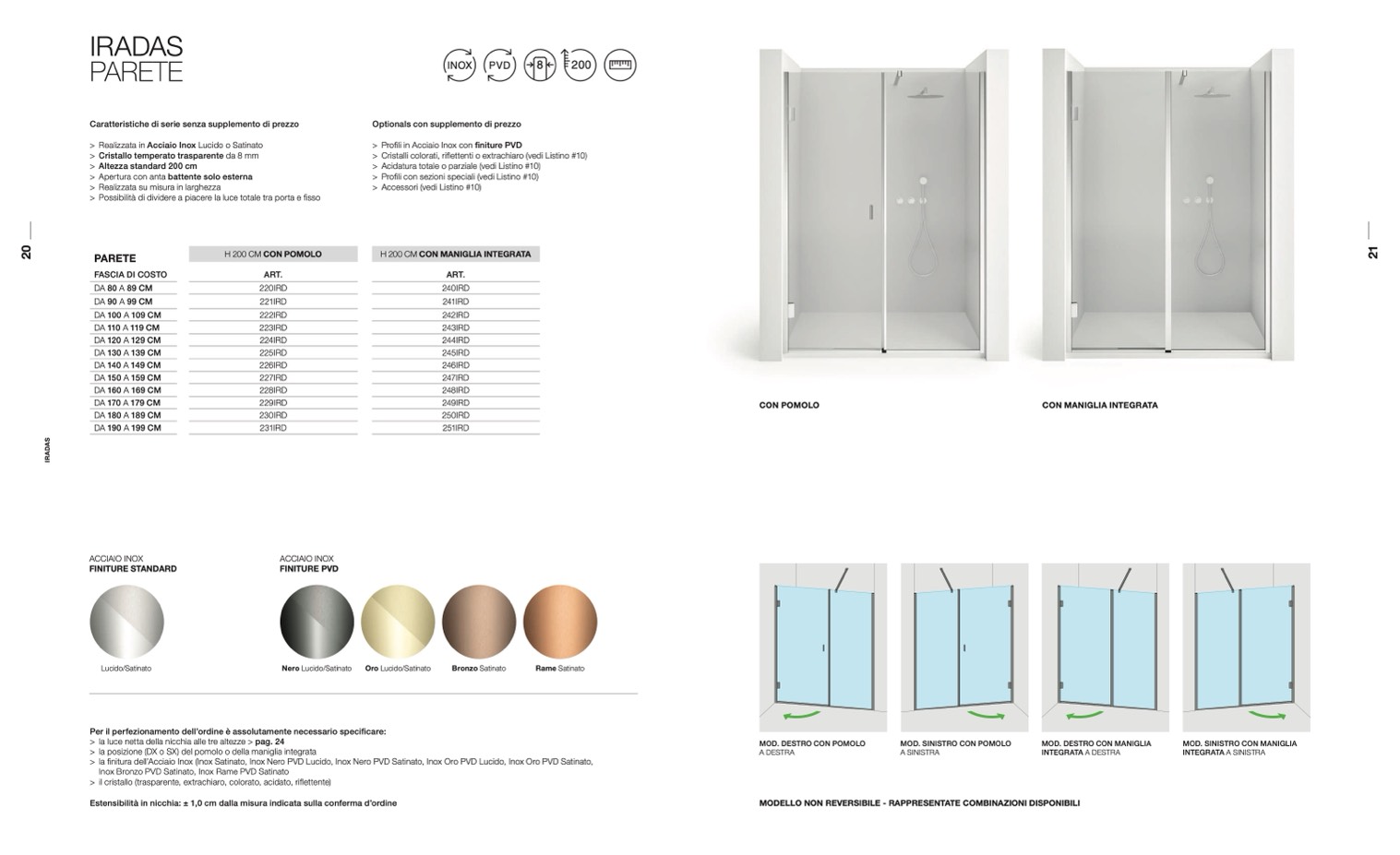 > la finitura dell’Acciaio Inox (Inox Satinato, Inox Nero PVD Lucido, Inox Nero PVD Satinato, Inox Oro PVD Lucido, Inox Oro PVD Satinato,