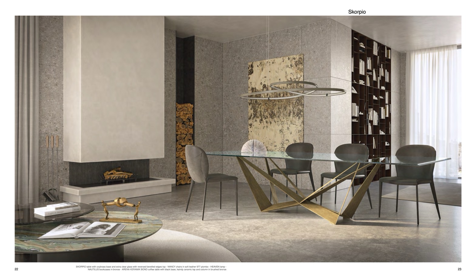 SKORPIO table with oxybrass base and extra clear glass with reversed bevelled edges top - NANCY chairs in soft leather 977 piombo - HEAVEN lamp -