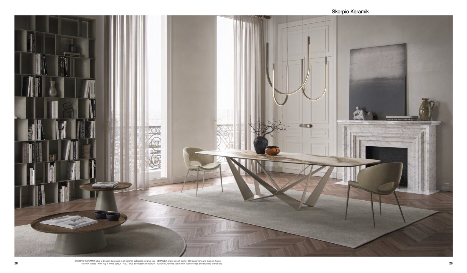 SKORPIO KERAMIK table with pearl base and matt borghini calacatta ceramic top - MIRANDA chairs in soft leather 969 cashmere and titanium frame -