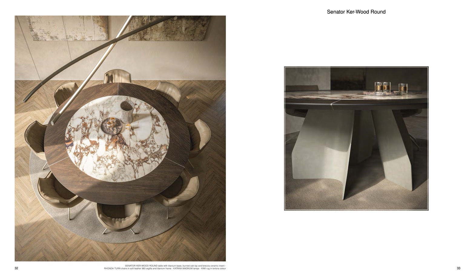 SENATOR KER-WOOD ROUND table with titanium base, burned oak top and breccia ceramic insert -
