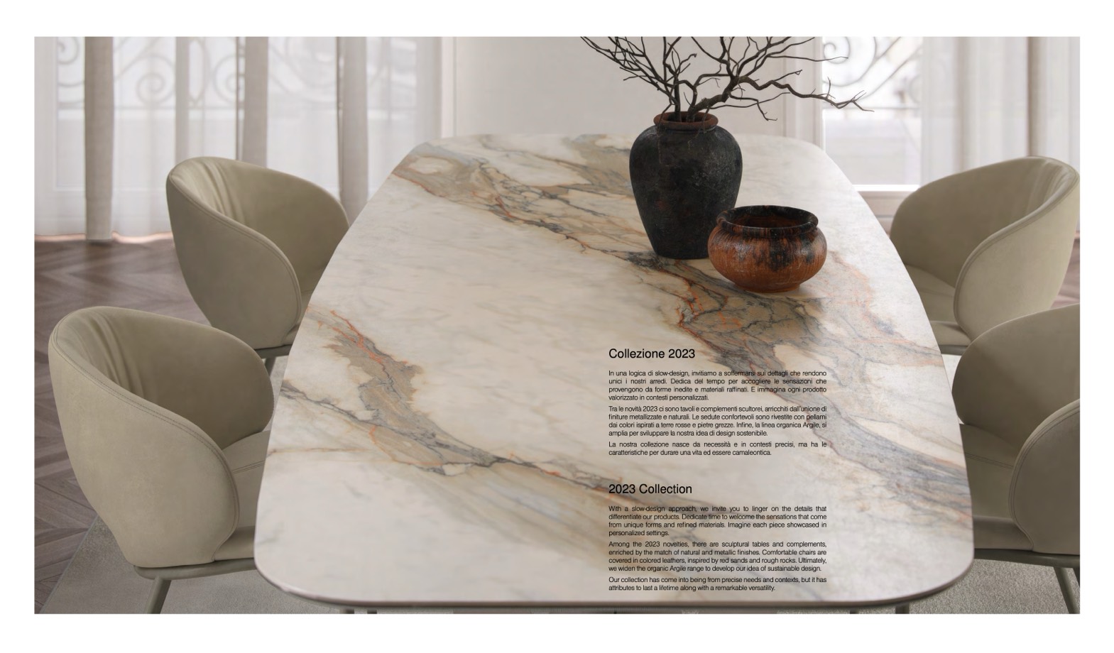 Tra le novità 2023 ci sono tavoli e complementi scultorei, arricchiti dall’unione di