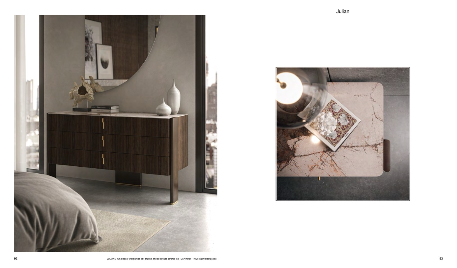 JULIAN 3-136 dresser with burned oak drawers and corcovado ceramic top - DAY mirror - KIMI rug in tortora colour