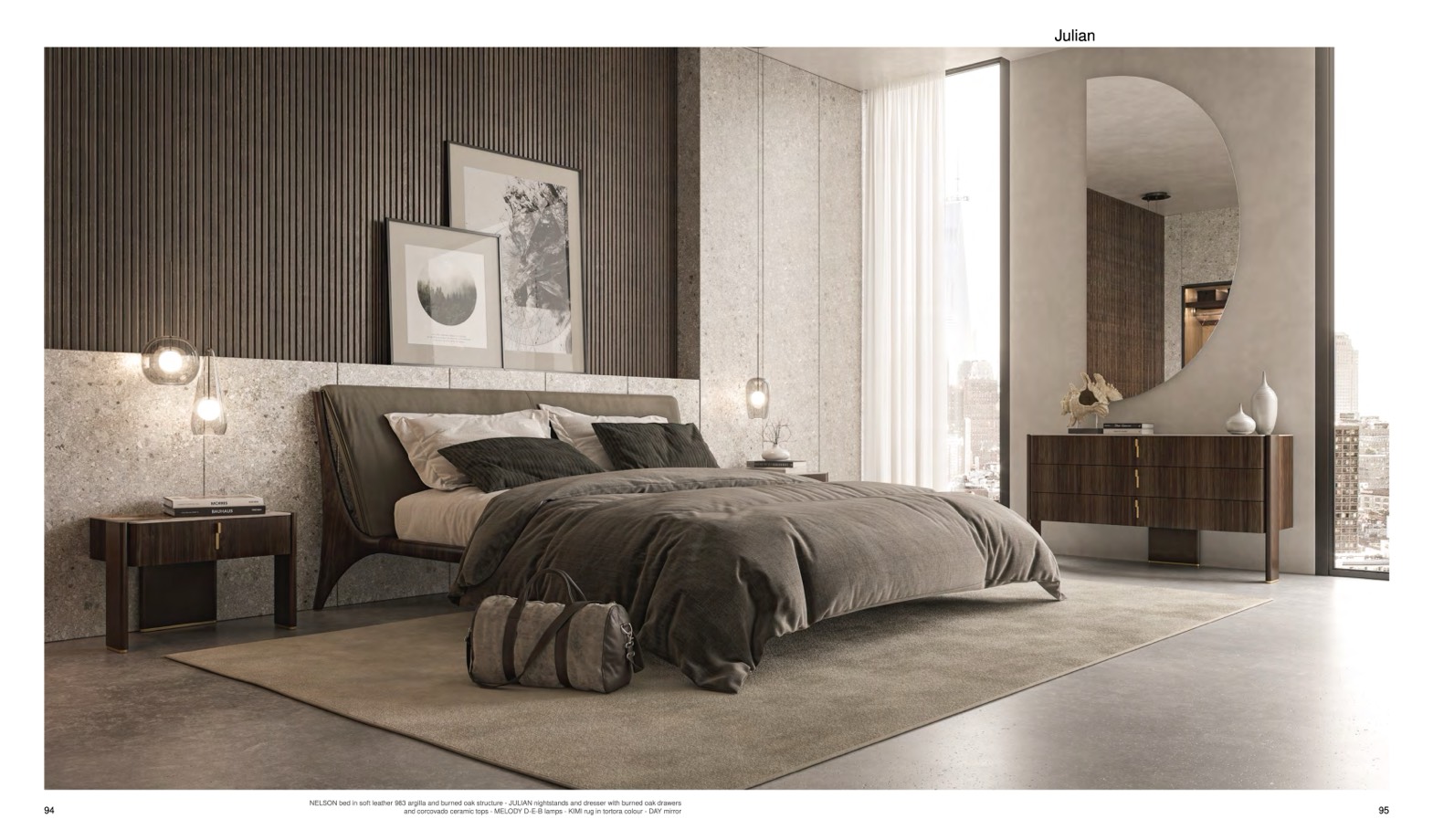 NELSON bed in soft leather 983 argilla and burned oak structure - JULIAN nightstands and dresser with burned oak drawers
