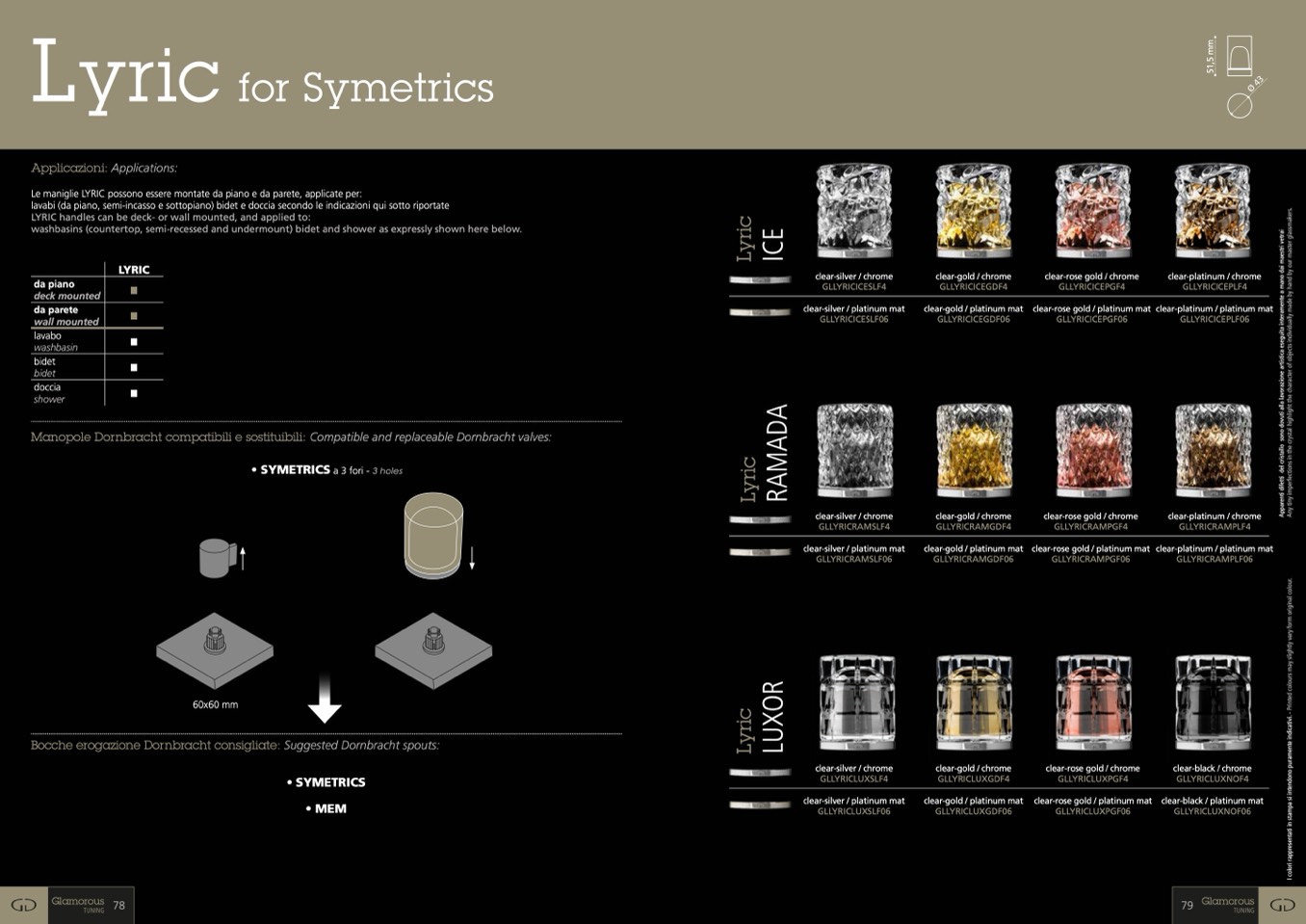 Le maniglie LYRIC possono essere montate da piano e da parete, applicate per: