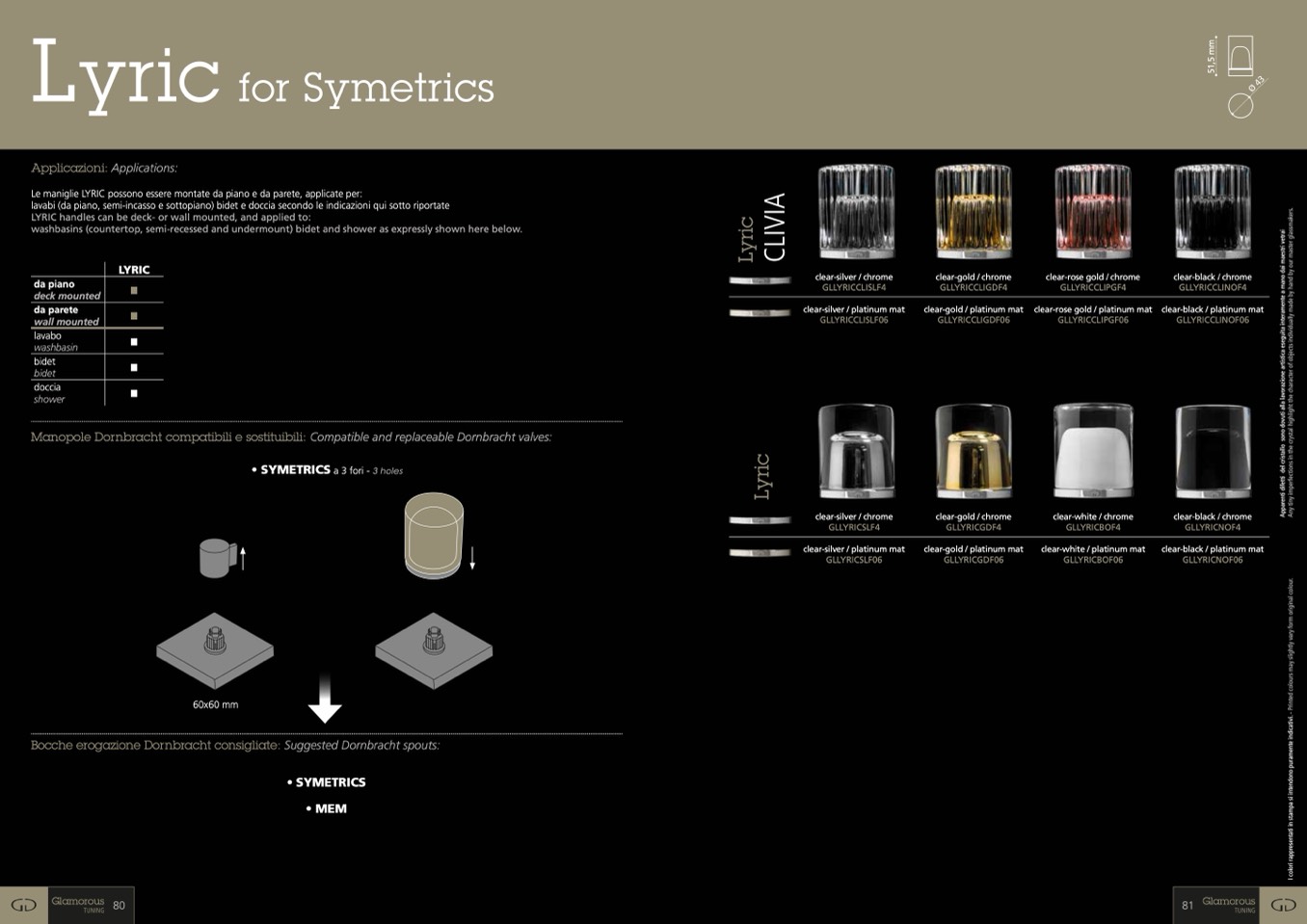 Le maniglie LYRIC possono essere montate da piano e da parete, applicate per: