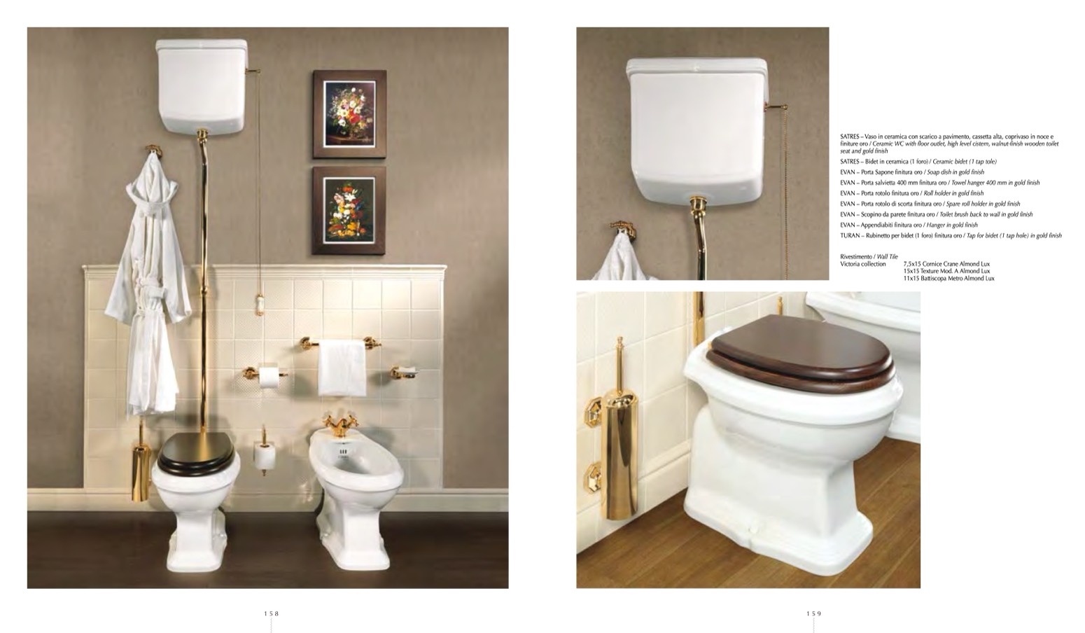 finiture oro / Ceramic WC with floor outlet, high level cistern, walnut-finish wooden toilet