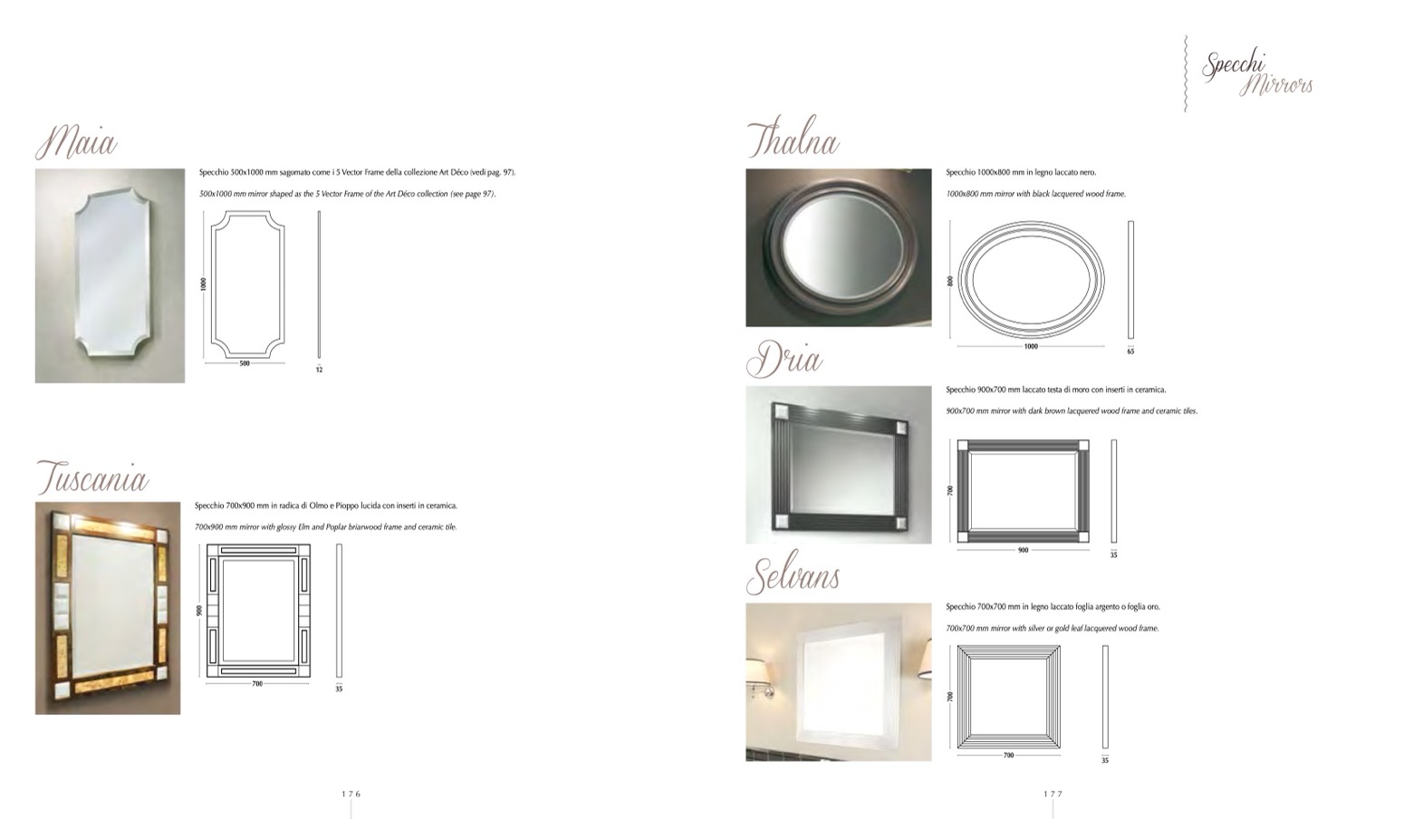700x700 mm mirror with silver or gold leaf lacquered wood frame.
