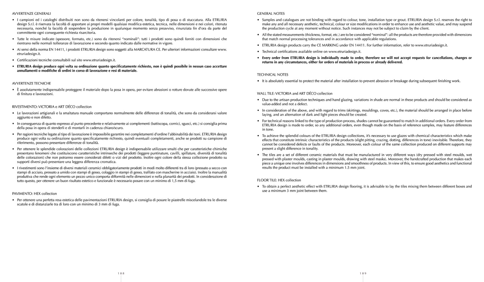 • Samples and catalogues are not binding with regard to colour, tone, installation type or grout. ETRURIA design S.r.l. reserves the right to