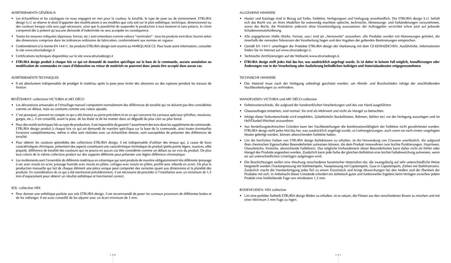 • Muster und Kataloge sind in Bezug auf Farbe, Farbtöne, Verlegungsart und Verfugung unverbindlich. Die ETRURIA design S.r.l. behält