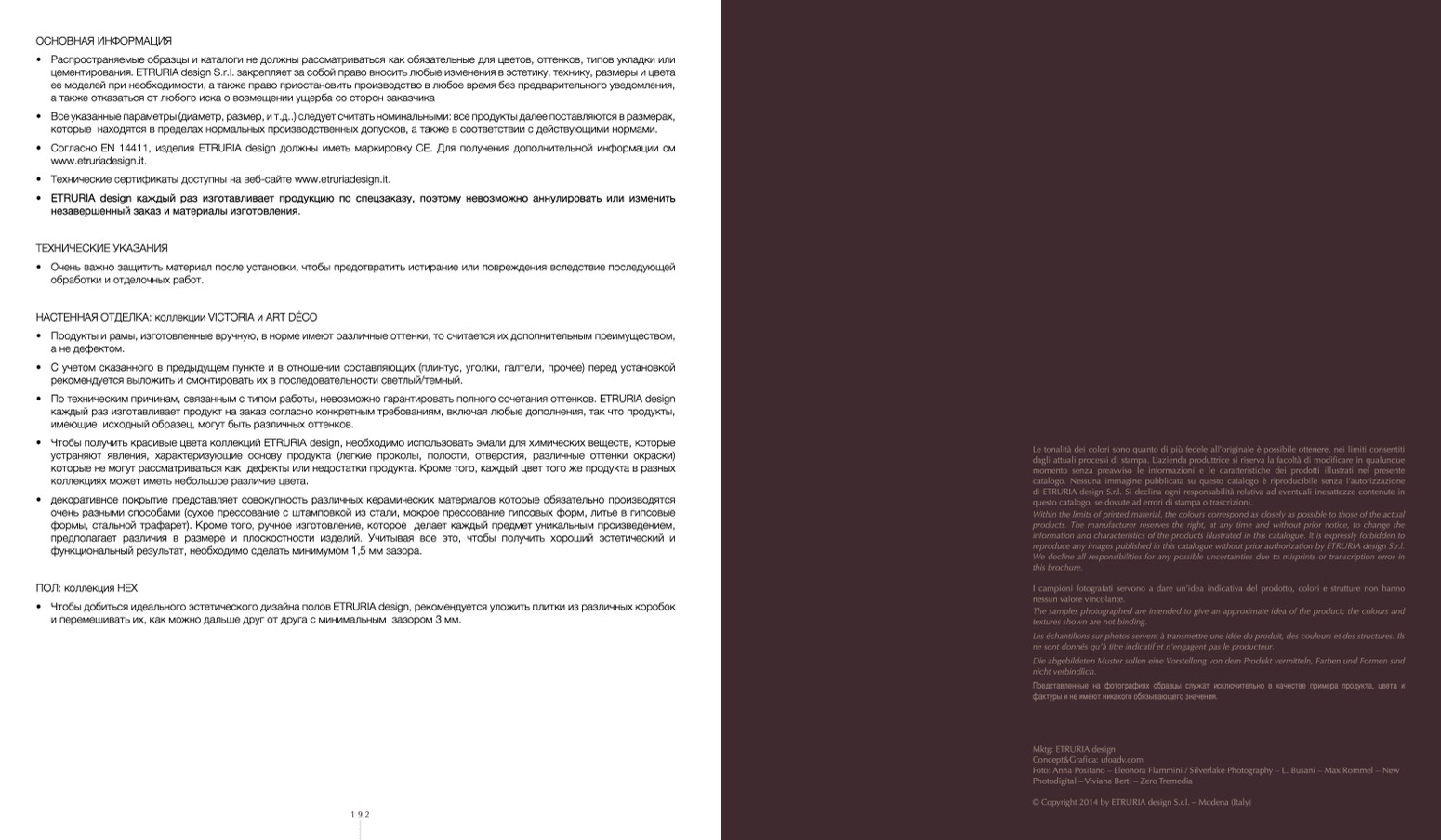 цементирования. ETRURIA design S.r.l. закрепляет за собой право вносить любые изменения в эстетику, технику, размеры и цвета