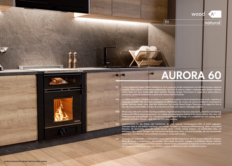 ENG Wood cooker with built-in or free-standing installation, high-temperature top oven, easy access, inspection and cleaning.