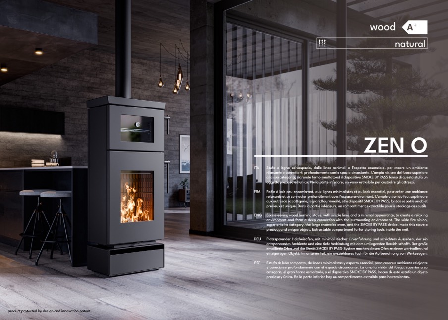 ENG Space-saving wood burning stove, with simple lines and a minimal appearance, to create a relaxing