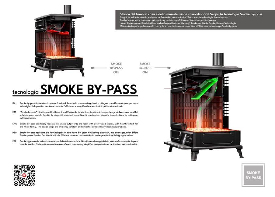 ENG Smoke by-pass drastically reduces the smoke output into the room with every wood charge, with healthy effect for