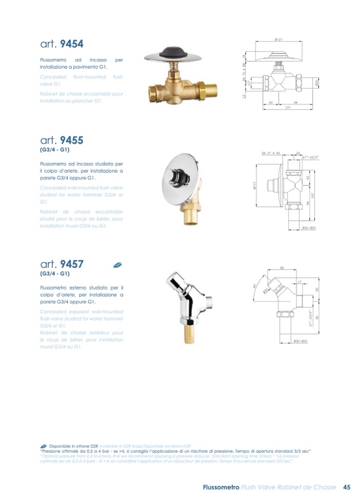 “Optimal pressure from 0.5 to 4 bars, if>4 we recommend applying a pressure reducer. Standard opening time 3/5sec” “La pression