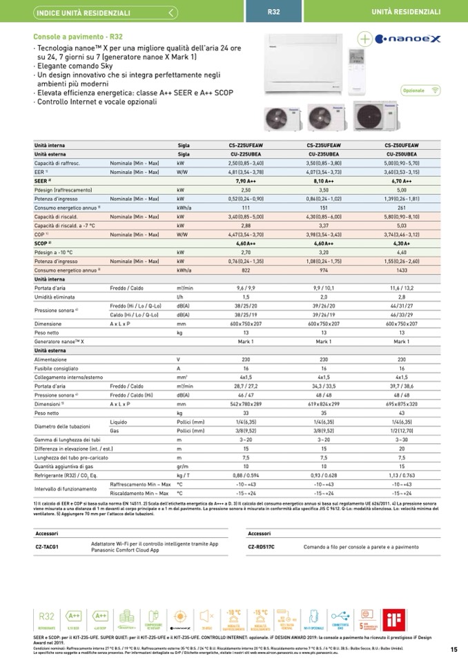 SEER e SCOP: per il KIT-Z35-UFE. SUPER QUIET: per il KIT-Z25-UFE e il KIT-Z35-UFE. CONTROLLO INTERNET: opzionale. iF DESIGN AWARD 2019: la console a pavimento ha ricevuto il prestigioso iF Design