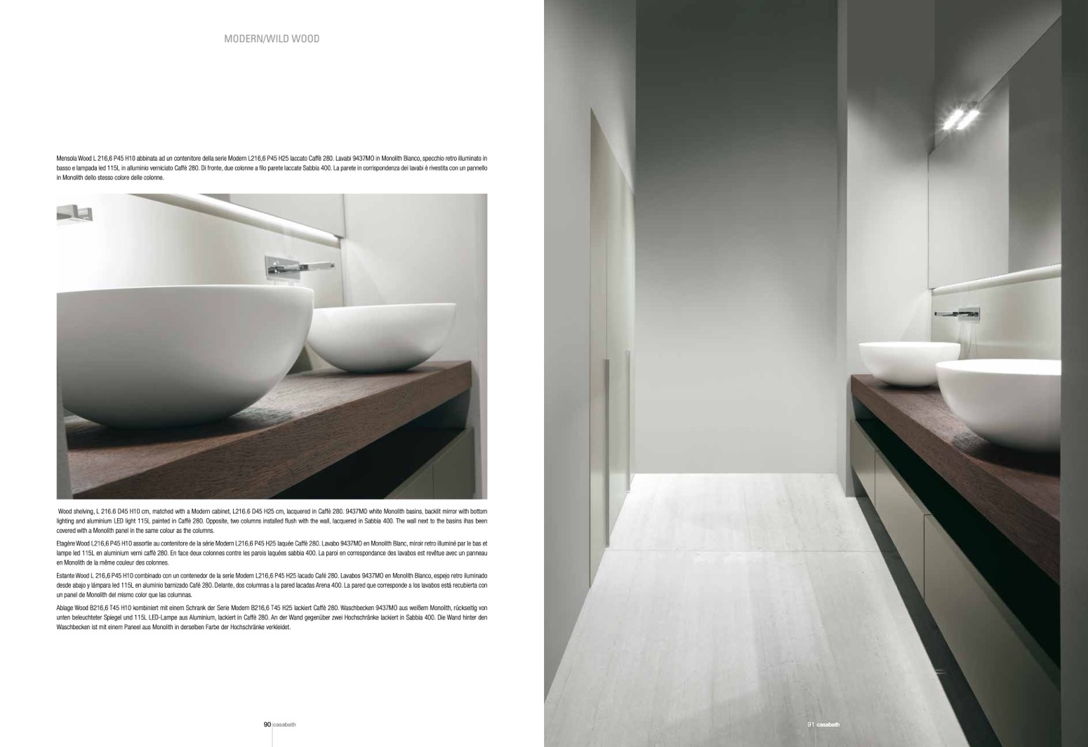 Wood shelving, L 216.6 D45 H10 cm, matched with a Modern cabinet, L216.6 D45 H25 cm, lacquered in Caffè 280. 9437MO white Monolith basins, backlit mirror with bottom