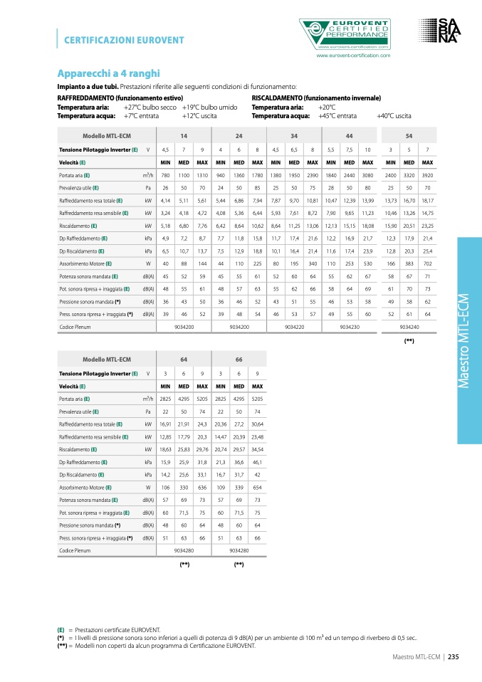 (**) = Modelli non coperti da alcun programma di Certificazione EUROVENT.