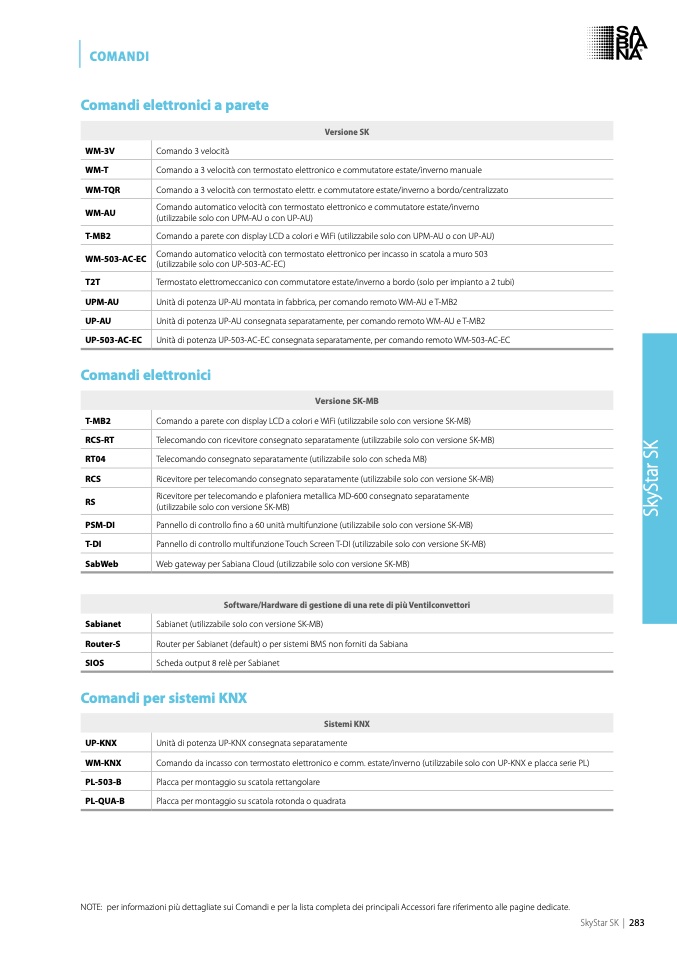 NOTE: per informazioni più dettagliate sui Comandi e per la lista completa dei principali Accessori fare riferimento alle pagine dedicate.