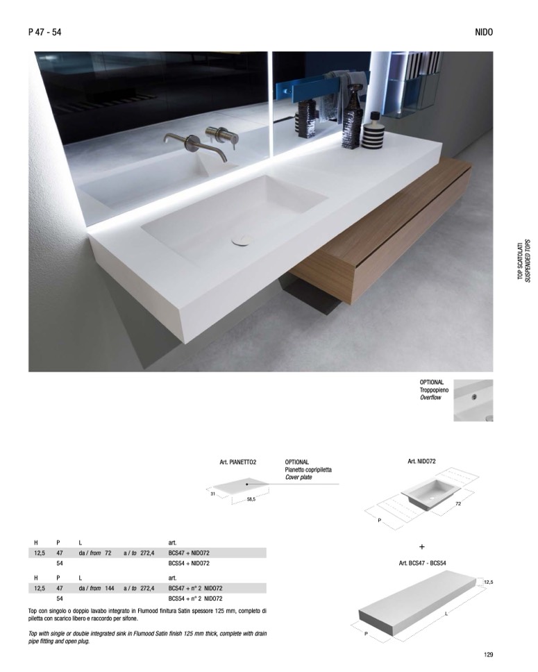 Top con singolo o doppio lavabo integrato in Flumood finitura Satin spessore 125 mm, completo di