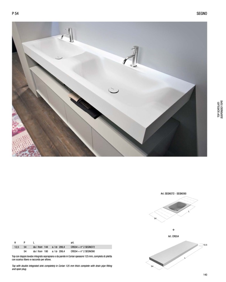 Top con doppio lavabo integrato soprapiano o da parete in Corian spessore 125 mm, completo di piletta
