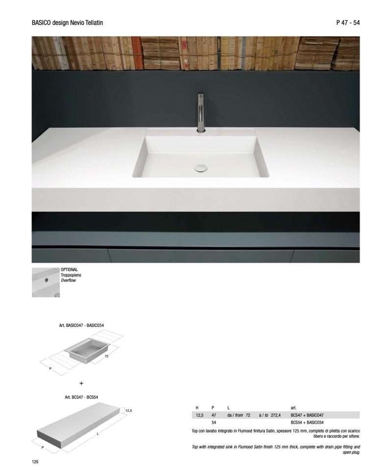 Top con lavabo integrato in Flumood finitura Satin, spessore 125 mm, completo di piletta con scarico