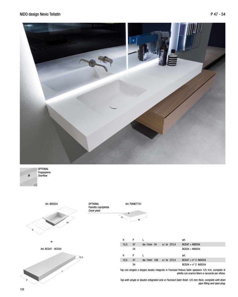 Top con singolo o doppio lavabo integrato in Flumood finitura Satin spessore 125 mm, completo di