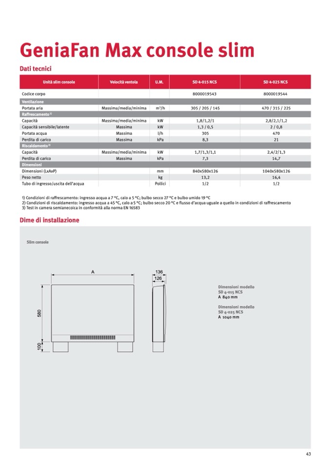 2) Condizioni di riscaldamento: ingresso acqua a 45 °C, calo a 5 °C; bulbo secco 20 °C e flusso d’acqua uguale a quello in condizioni di raffrescament