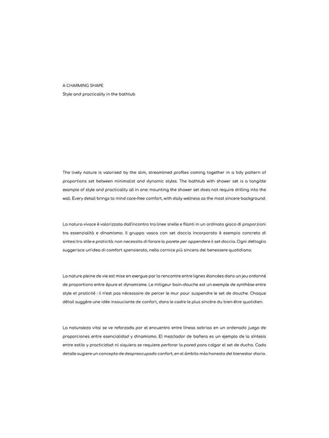 proportions set between minimalist and dynamic styles. The bathtub with shower set is a tangible