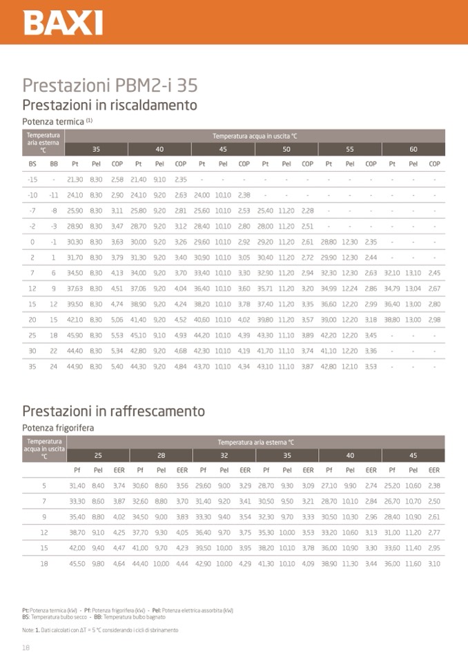 Pt: Potenza termica (kW) - Pf: Potenza frigorifera (kW) - Pel: Potenza elettrica assorbita (kW)