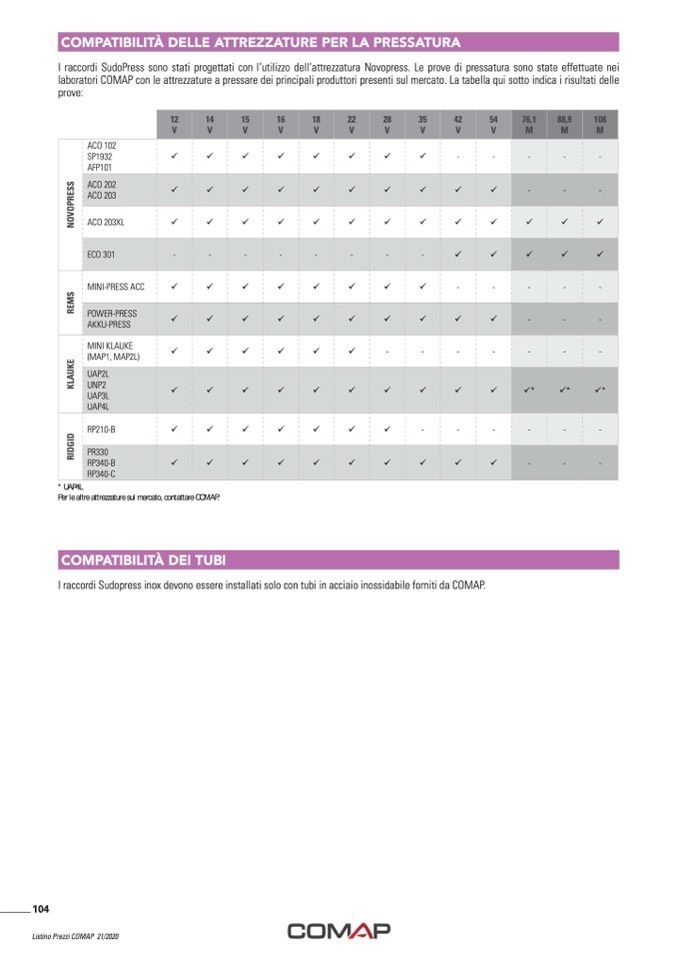 I raccordi Sudopress inox devono essere installati solo con tubi in acciaio inossidabile forniti da COMAP.