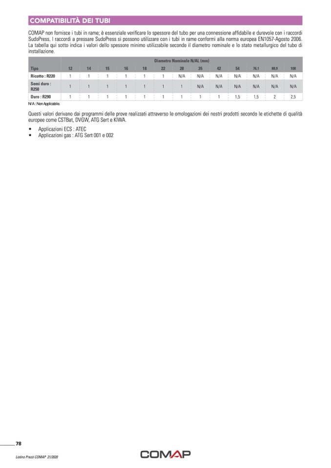 COMAP non fornisce i tubi in rame; è essenziale vericare lo spessore del tubo per una connessione afdabile e durevole con i raccordi