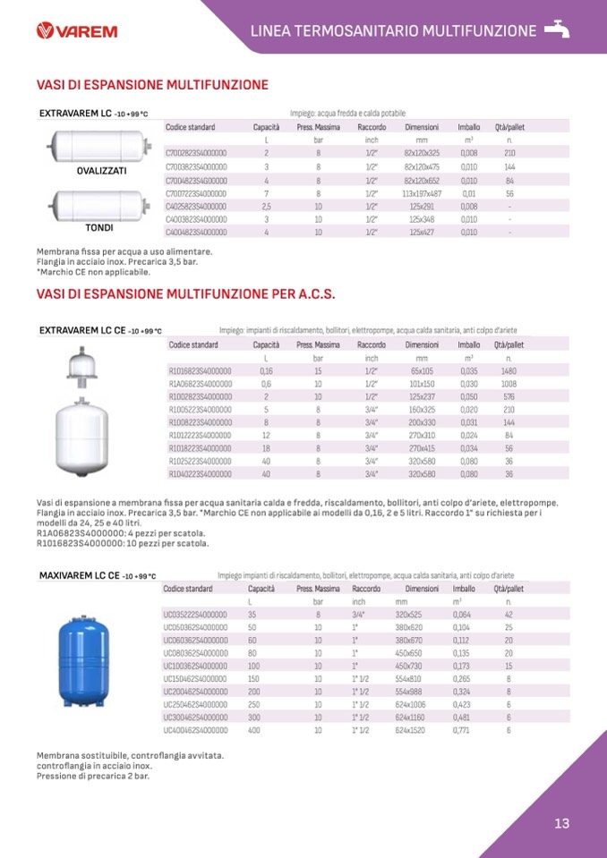 Vasi di espansione a membrana fissa per acqua sanitaria calda e fredda, riscaldamento, bollitori, anti colpo d’ariete, elettropompe.