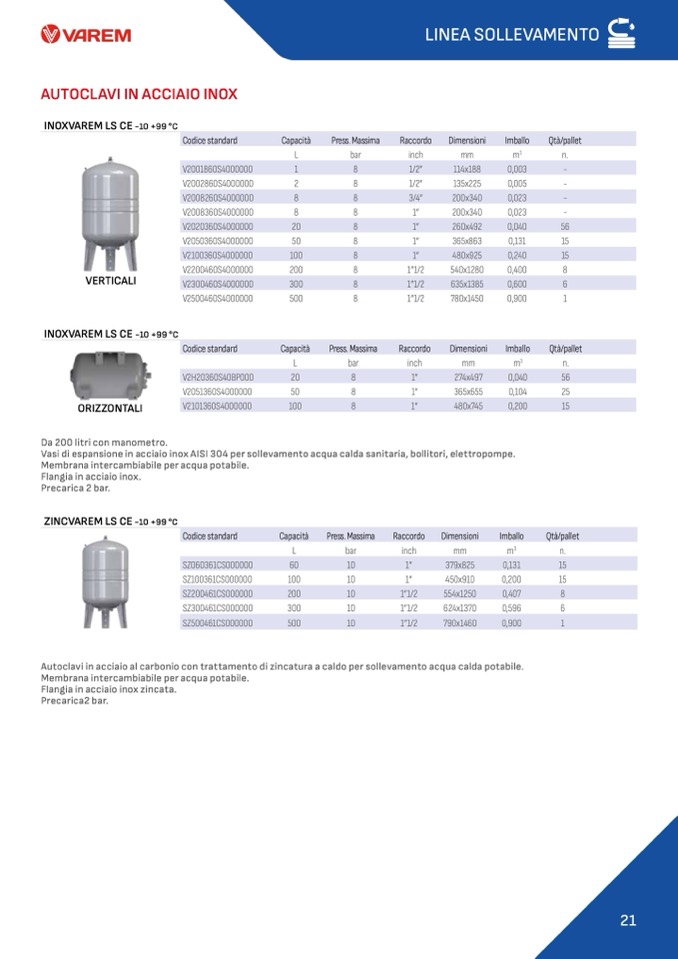 Vasi di espansione in acciaio inox AISI 304 per sollevamento acqua calda sanitaria, bollitori, elettropompe.