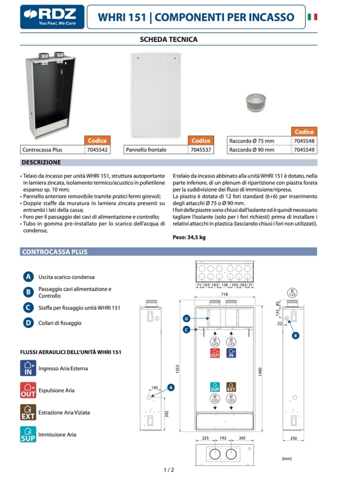 Il telaio da incasso abbinato alla unità WHRI 151 è dotato, nella
